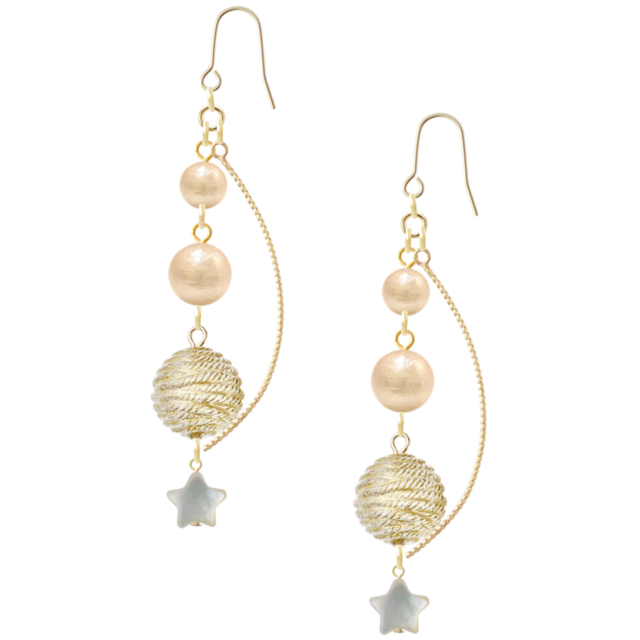 軽やかなコットンパールとロープボール、そして揺れるシェルの星が、空にきらめく星々のような印象を与える「Shizuku」シリーズ。繊細なツイストバーが動きにニュアンスを添え、顔まわりに上品な華やかさをプラスしてくれます。